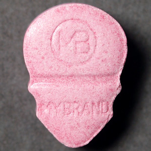 Red skull face-shaped tablet, breakline on back with MB in a circle and 'MYBRAND'.