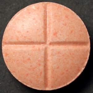 Round peach-orange tablet with E 401 on one side, dual intersecting break lines on back. Counterfeit generic Adderall.
