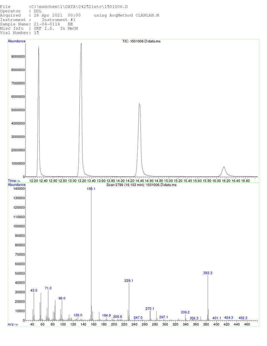 Details on the previously unidentified substances: all are triglyceride fatty acids that are not psychoactive and could possibly be a single fatty acid that was transformed during analysis by the heat and pressure of gas chromatography into these four distinct substances. Since we reported them as four unidentified compounds initially, we list the full identifications here: