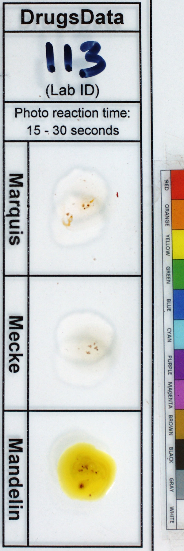 Marquis:More infoThe Marquis Test is a reagent field test conducted by placing a drop of reagent liquid onto a small sample of the material being tested. The chemicals in the reagent react differently with different chemicals, turning a variety of colors based on the what is in the material being tested. No Reaction (faint brown?)