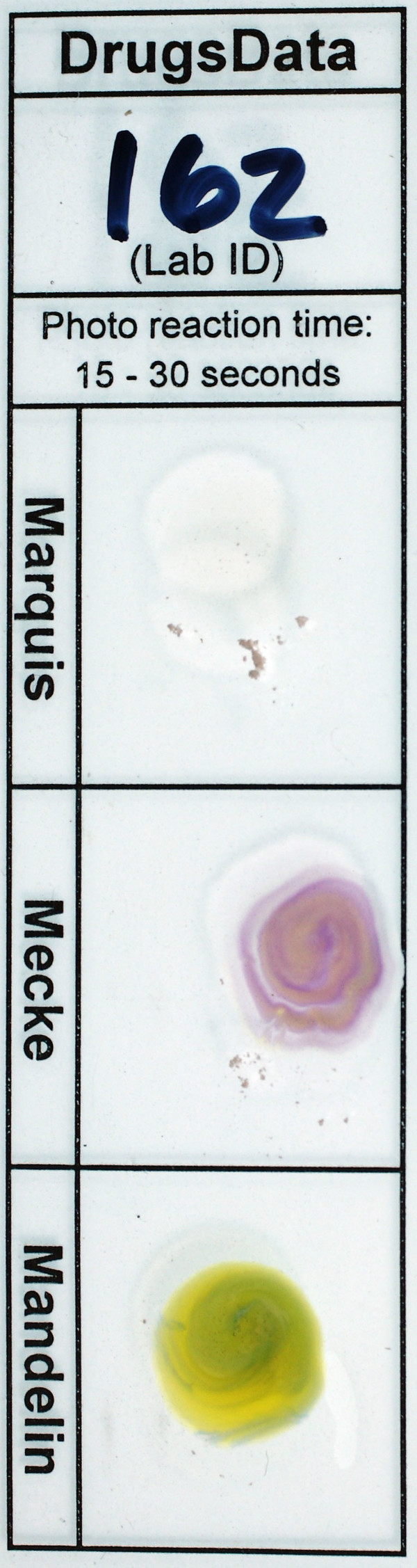 Sender comments that: 'Marquis and Mecke reagents reactions consistent with another 3-HO-PCP sample sent to DrugsData that was contaminated with 3-MeO-PCP. Mandelin reagent reacted brown with green center.'