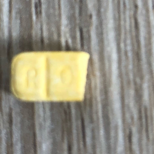 Yellow powder, from a yellow tablet. An 'R' and '0' are visible in photo. [DrugsData accepts partial tablets and pulverized tablets by prior approval only.]