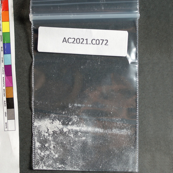 White powder in baggie. Described by sender as clear crystal shards, with light purple coloration.