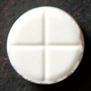 Round white tablet with intersecting break lines. Acquired in 2020.