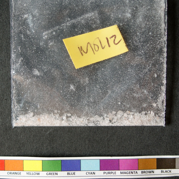 Clear/white and pinkish-tan crystalline powder in baggie.