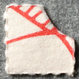 Dose unit of blotter with design that resembles a glyph from the Dreamspell calendar. Red on white design on back.