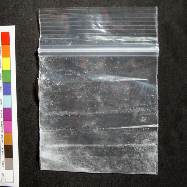 Light blue powder residue in baggie. Sample name given as 'Perc 30'.