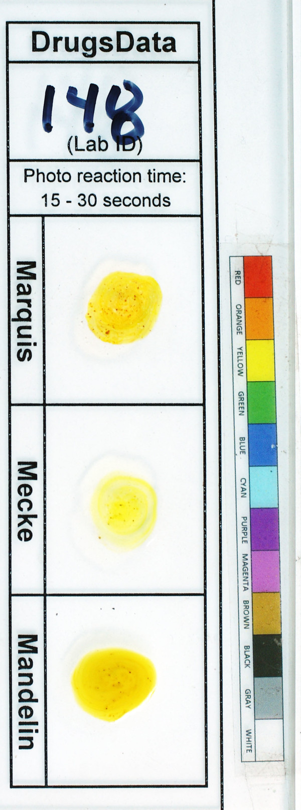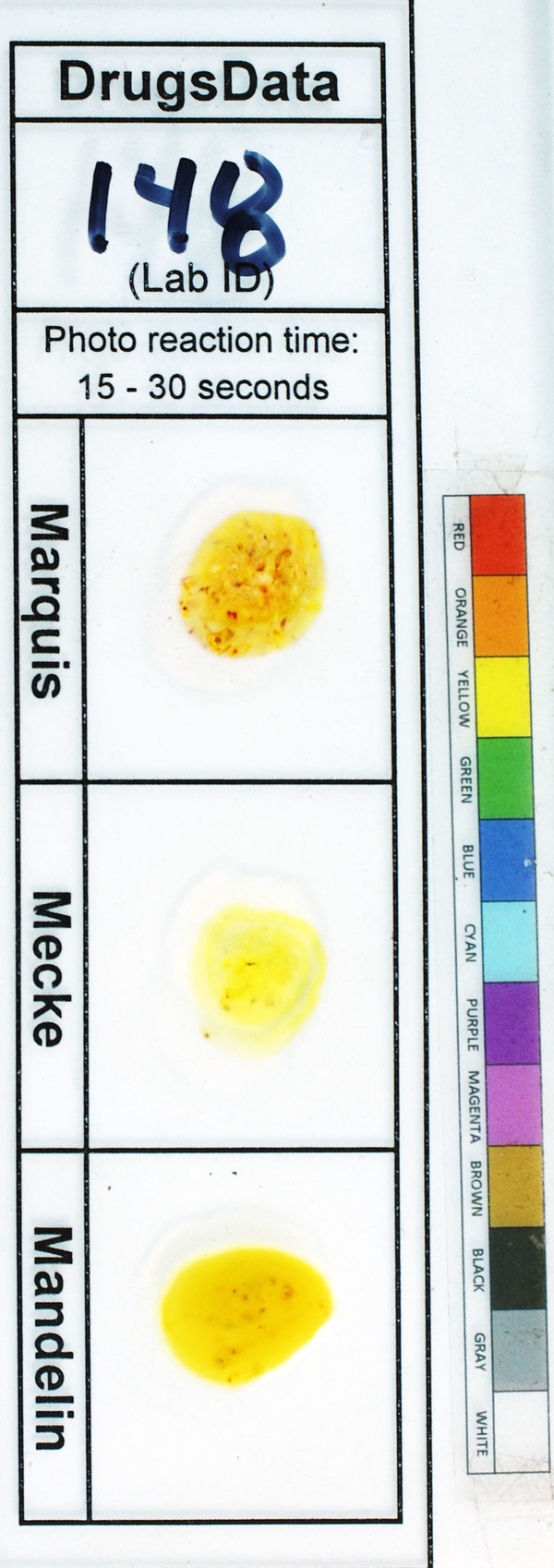 Marquis:More infoThe Marquis Test is a reagent field test conducted by placing a drop of reagent liquid onto a small sample of the material being tested. The chemicals in the reagent react differently with different chemicals, turning a variety of colors based on the what is in the material being tested. Orange / Yellow