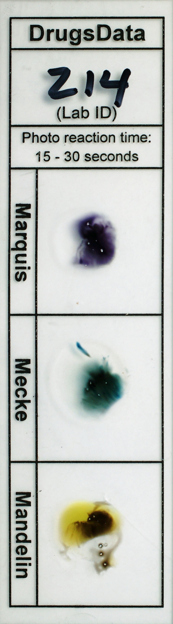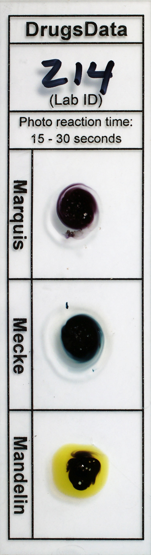 Submitter notes that (prior to sending sample): ''Reagent results were confusing: Mandelin: black, Marquis: dark purple, Froehde: purple -> black, Mecke: dark purple, Liebermann: black, Simon: slow faint purple.''