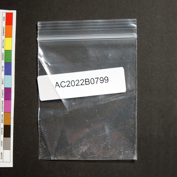 Off-white (''eggshell'' color) powder residue in baggie.