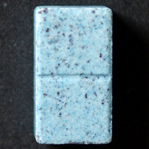 Blue speckled (''glittery'') rectangular Rolls Royce logo tablet with break line on reverse side.