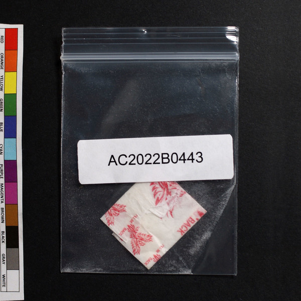 Yellow/off-white powder residue in paper bag with I'LL BE BACK/phoenix stamp in red ink.
