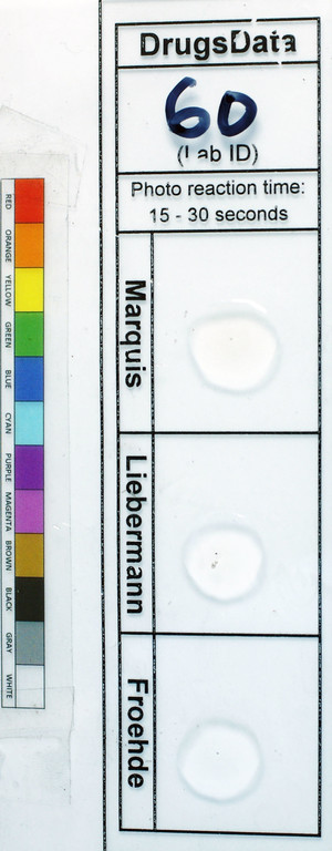 The analysis results have not changed (still 10 parts ketamine / 1 part ketamine precursor A), but the reagent photo, left, has been replaced. There is no Froehde reaction showing in the new photo.