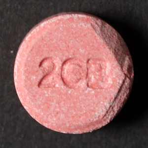Round pink tablet with a smiley face imprint on front and '2CB' imprint on back.