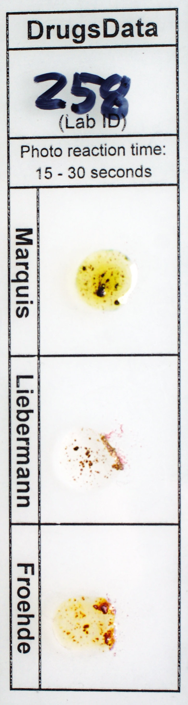 Submitter notes that (prior to sending): 'Marquis: Yellow -> Dark Green/Brown -> Brown/Black; Simon's: No Reaction; Froehde: Yellow-brown; Fentanyl Test Strip: Negative'.