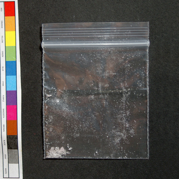 White/clear crystalline powder in baggie.
