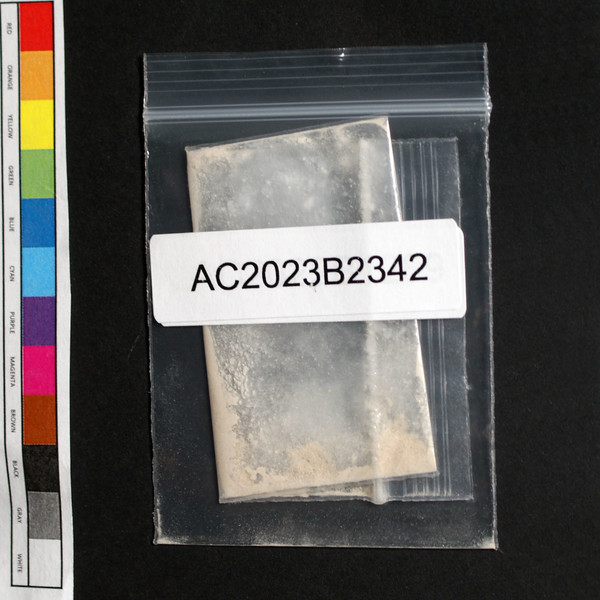 Light brown powder with white crystals in baggie.