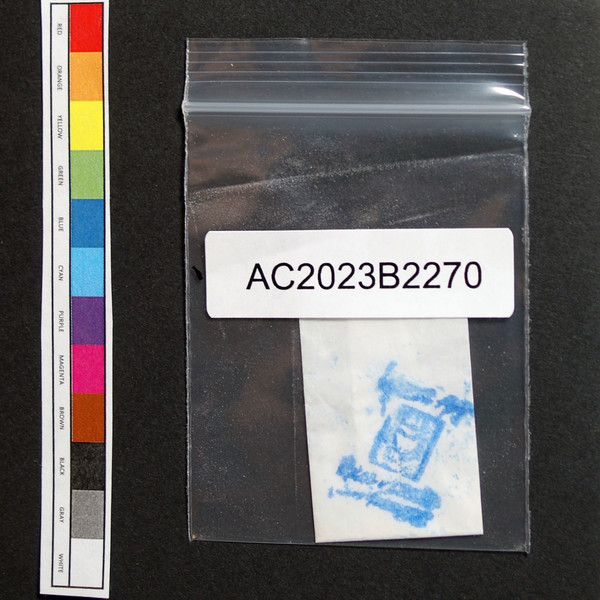 Off-white powder in paper bag with unknown stamp in baggie.