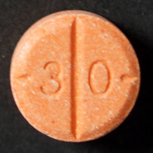 Round orange tablet with 'd p' and '3 0' markings with break line.