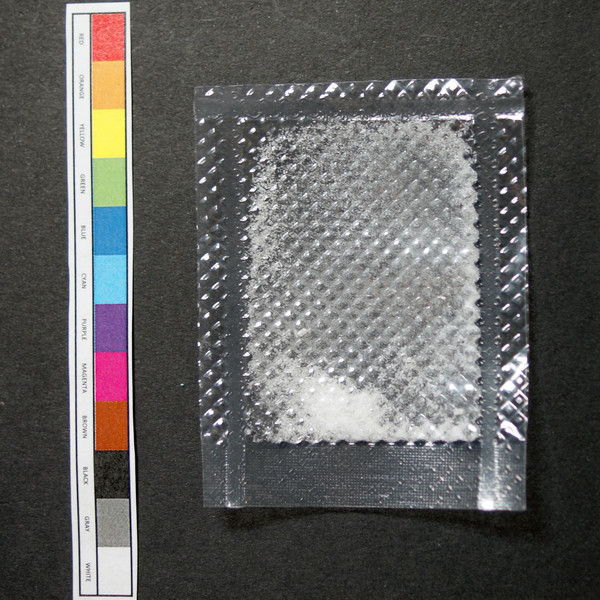 White powder in heat-sealed plastic pouch.