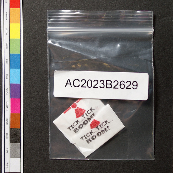 Off-white powder in paper bag with 'TICK, TICK, BOOM' stamp in baggie.