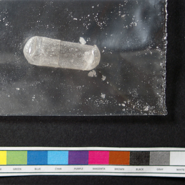 Clear-white crystal chunks and powder and broken capsule in baggie.
