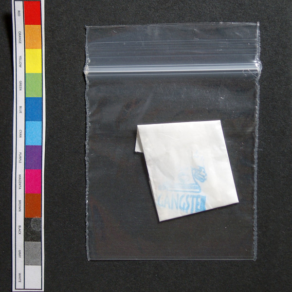 Off-white powder in paper bag with ''AMERICAN GANGSTER'' stamp in baggie.