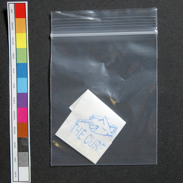 Off-white powder in paper bag with ''THE CURE'' and hand holding syringe stamp, in baggie.