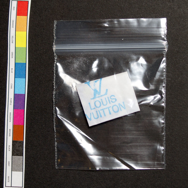 Soft light purple powder in paper bag with ''LOUIS VUITTON'' stamp in baggie.