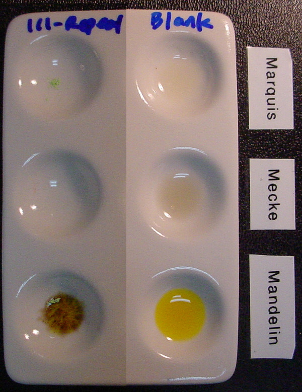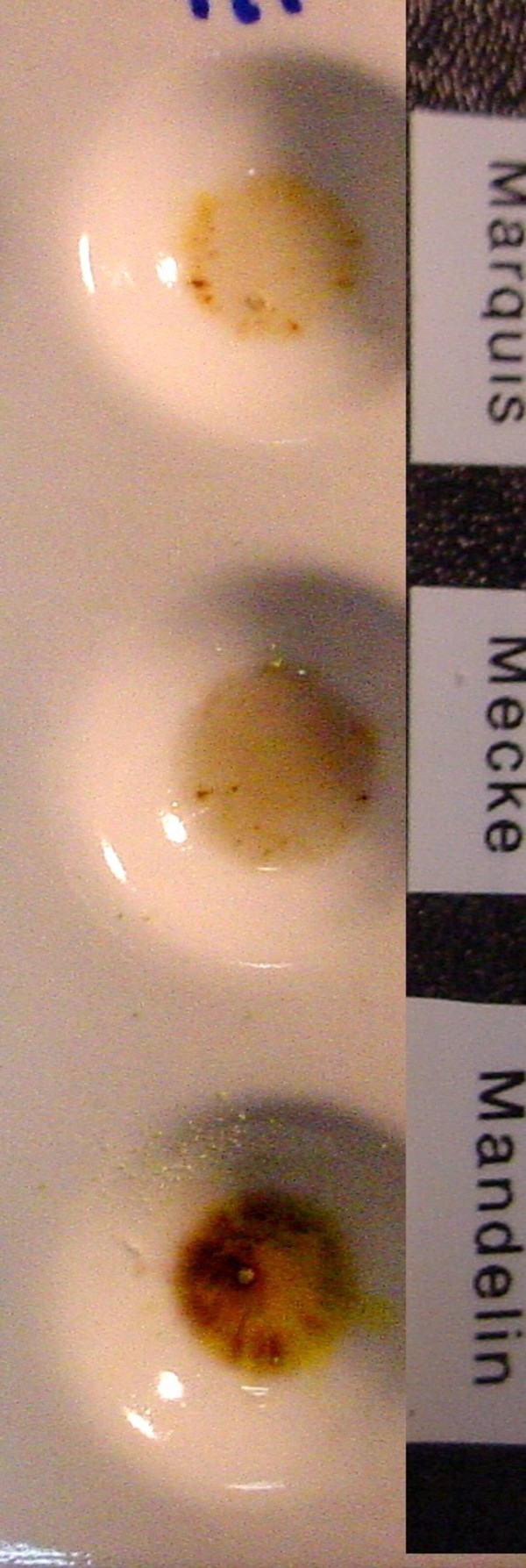 Since this was our first PMA result with the Mandelin reagent being used by the lab, we had the lab re-run the result and show a detail image here showing the blank Mandelin (yellow) next to the reaction found with this sample.