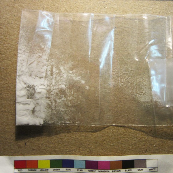 Provisionally identified as starch. No drugs detected, tested several times, salt ruled out, sugar ruled out, consistent with a field test for simple starch.