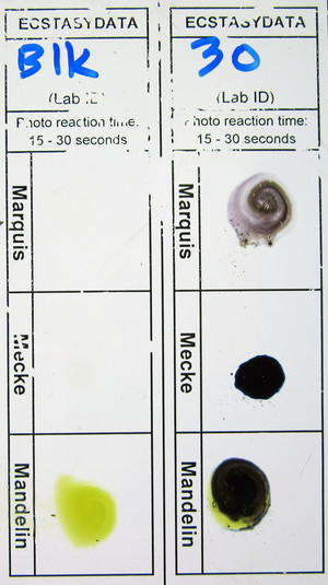 We need the help of outside expert analytical chemists and drug geeks to determine what substance matches the mass spectrum (MS) fingerprint. The lab's GC/MS graphs can be viewed by clicking on the thumbnails on this page.