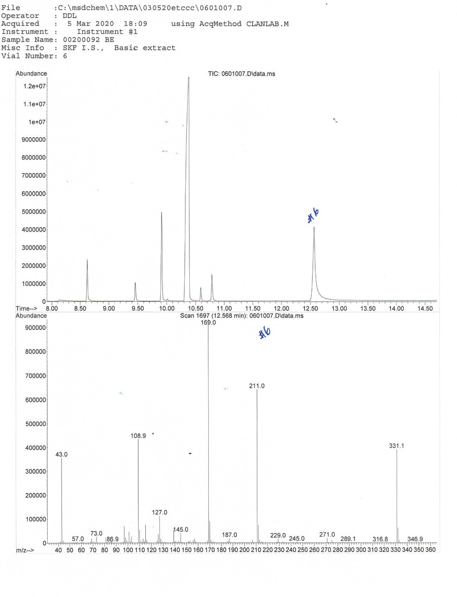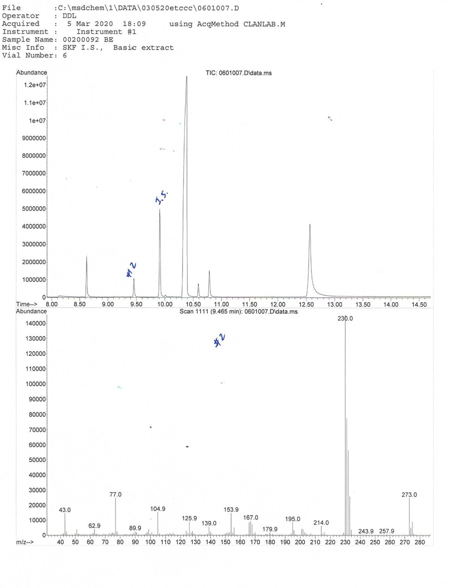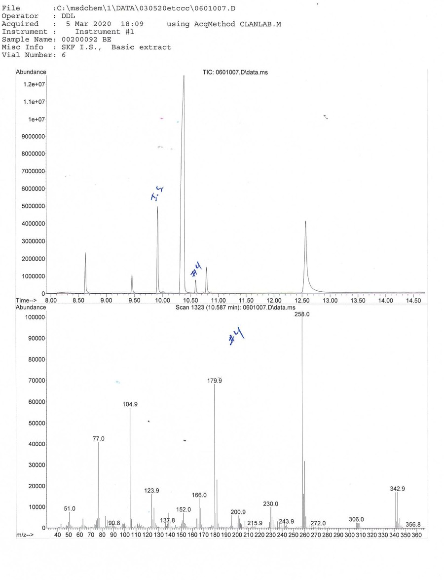 We need the help of outside expert analytical chemists and drug geeks to determine what substance matches the mass spectrum (MS) fingerprint. The lab's GC/MS graphs can be viewed by clicking on the thumbnails on this page.