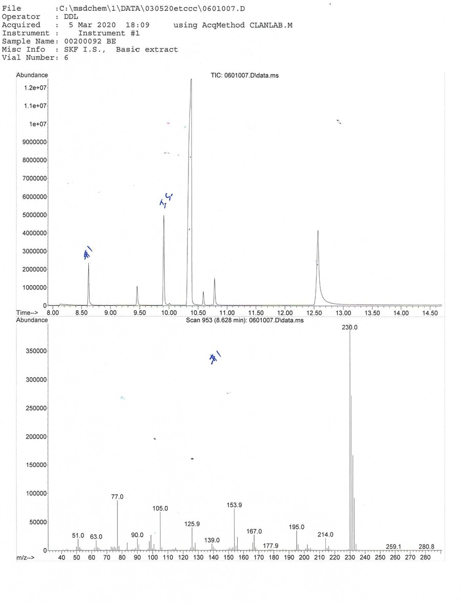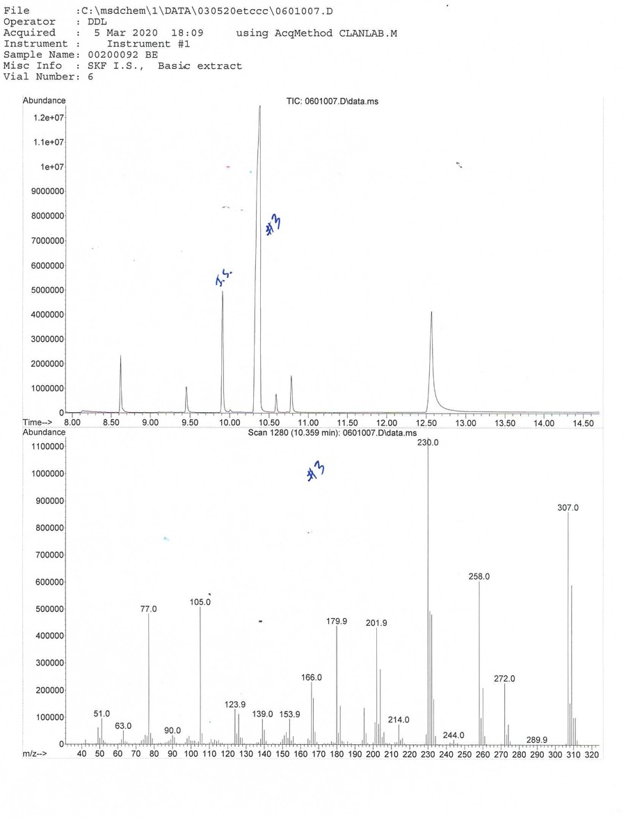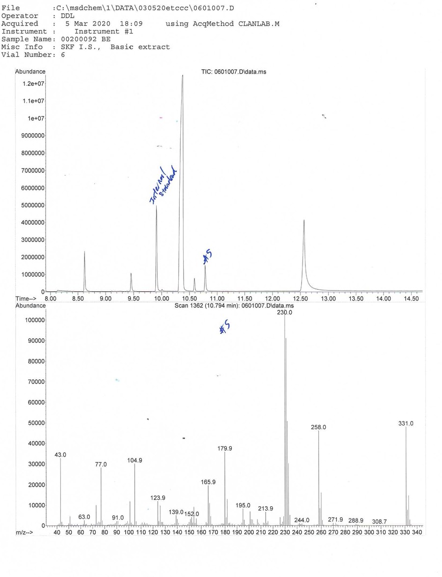 We need the help of outside expert analytical chemists and drug geeks to determine what substance matches the mass spectrum (MS) fingerprint. The lab's GC/MS graphs can be viewed by clicking on the thumbnails on this page.
