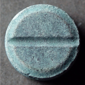 Grey-blue round tablet resembling a power button. Break line on back.
