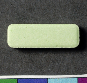 Light green bar-style tablet, imprint appears to be scraped off (two break lines faintly discernible). Blank / no markings on reverse side.