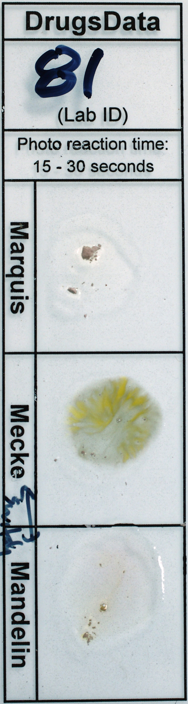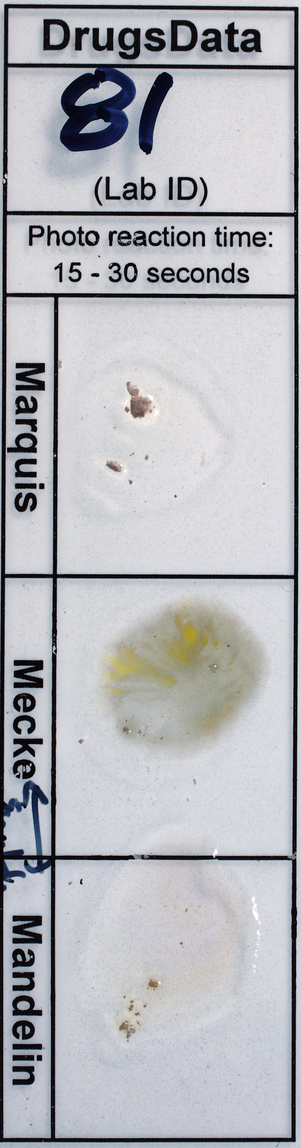 Analyzed twice. [Positions of Mecke and Mandelin reactions are switched - Mandelin is the light purple grey reaction in the middle of each reagent photo.]