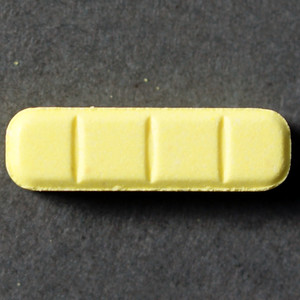 Yellow bar-style tablet with two scores and imprint R 0 3 9. Break lines on reverse side, too.