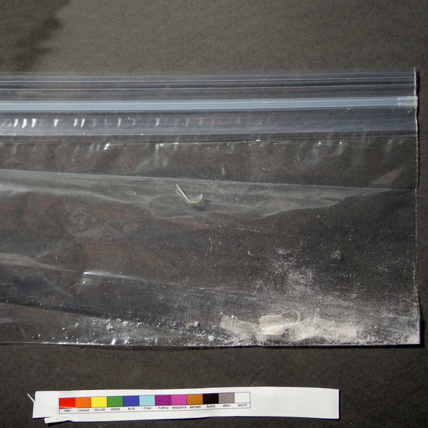 white crystalline powder with slight purplish tint, broken capsule in baggie.